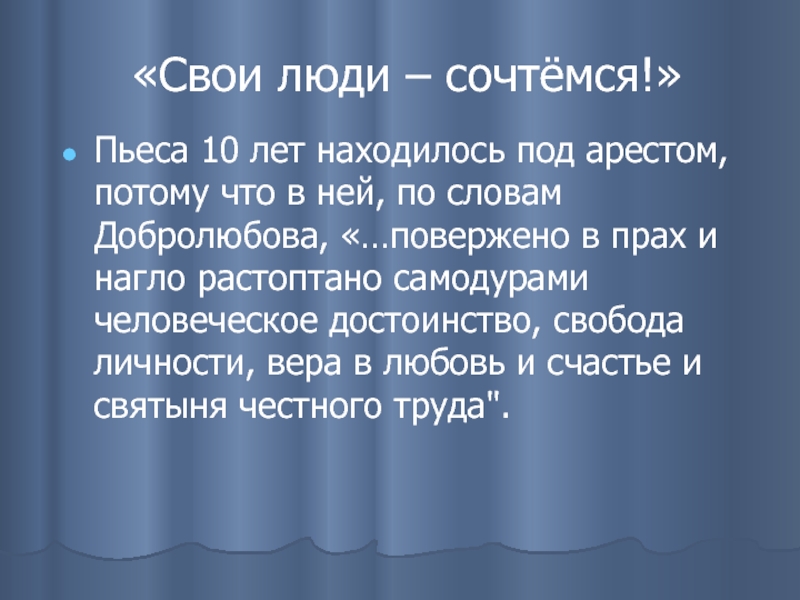 в ней, по словам Добролюбова, «…повержено в прах и нагло растоптано самодурами человеческое достоинство, свобода личности, вера в любовь и счастье и святыня честного труда".