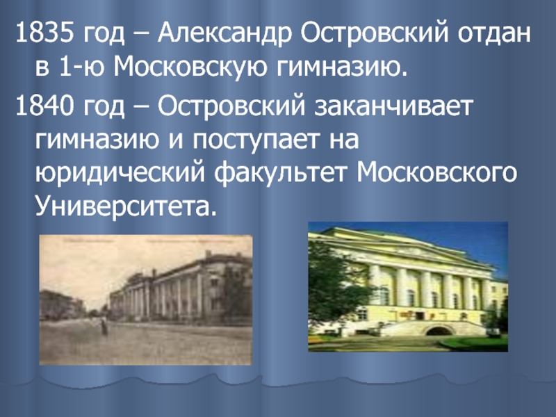 год – Островский заканчивает гимназию и поступает на юридический факультет Московского Университета.