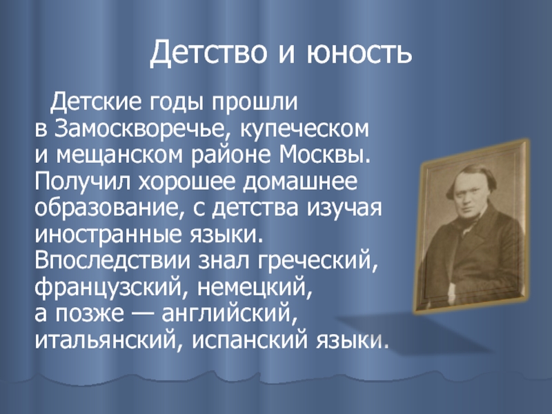 хорошее домашнее образование, с детства изучая иностранные языки. Впоследствии знал греческий, французский, немецкий, а позже — английский, итальянский, испанский языки.