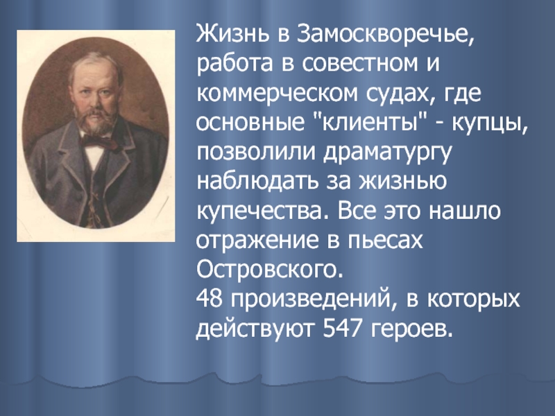 "клиенты" - купцы, позволили драматургу наблюдать за жизнью купечества. Все это нашло отражение в пьесах Островского.