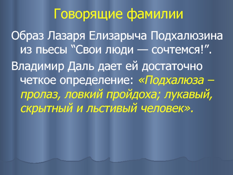 Образ Лазаря Елизарыча Подхалюзина из пьесы “Свои люди — сочтемся!”.