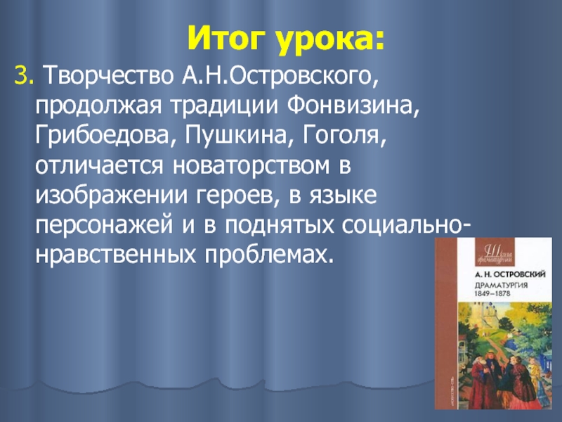 3. Творчество А.Н.Островского, продолжая традиции Фонвизина, Грибоедова, Пушкина, Гоголя, отличается