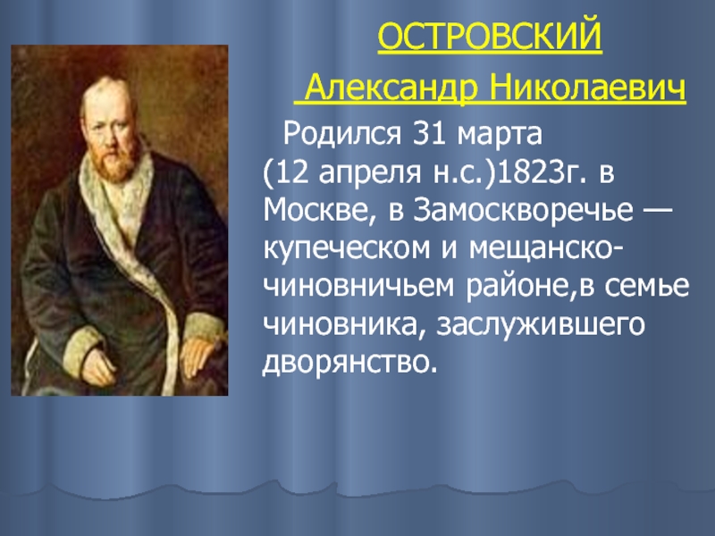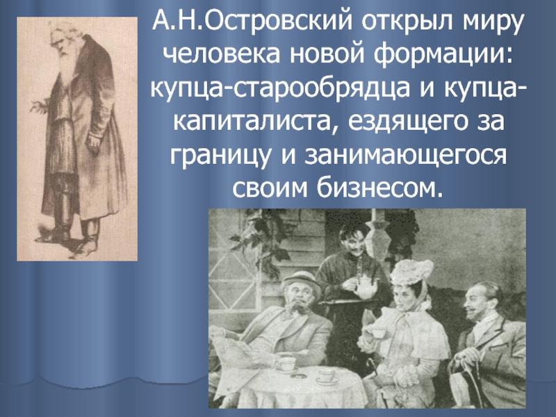 Слайд 4А.Н.Островский открыл миру человека новой формации: купца-старообрядца и купца-капиталиста, ездящего за