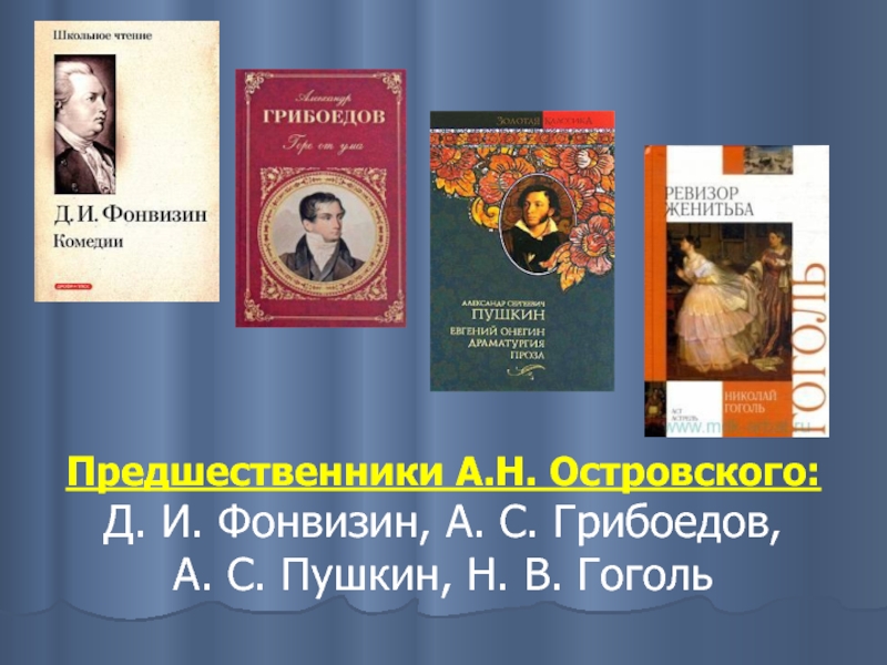 Слайд 3Предшественники А.Н. Островского: Д. И. Фонвизин, А. С. Грибоедов, А. С. Пушкин, Н. В. Гоголь