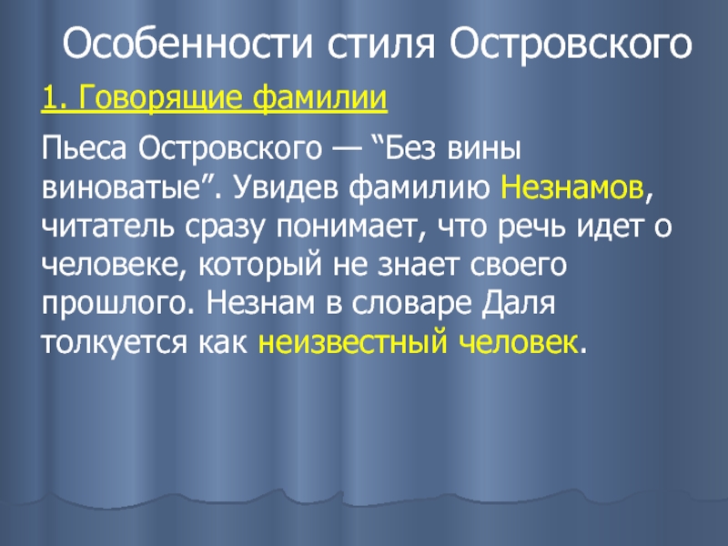 фамилию Незнамов, читатель сразу понимает, что речь идет о человеке, который не знает своего прошлого. Незнам в словаре Даля толкуется как неизвестный человек.