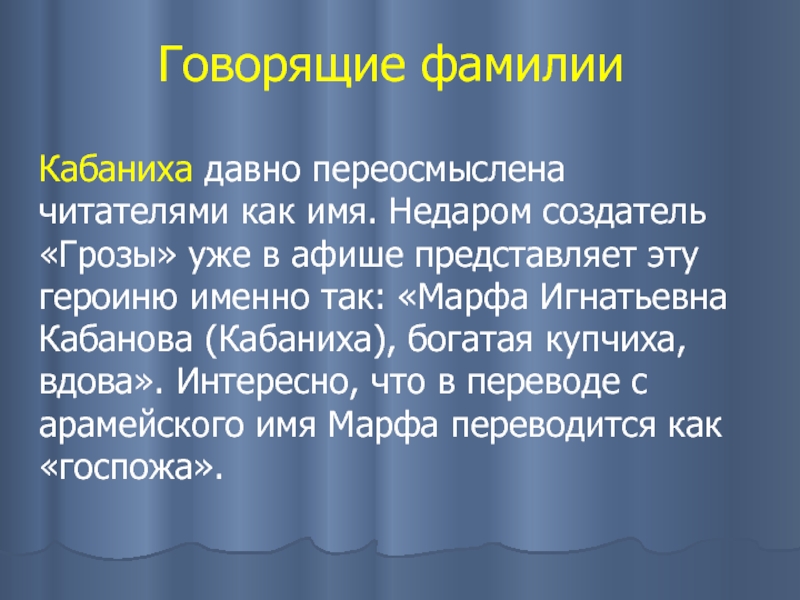 в афише представляет эту героиню именно так: «Марфа Игнатьевна Кабанова (Кабаниха), богатая купчиха, вдова». Интересно, что в переводе с арамейского имя Марфа переводится как «госпожа».
