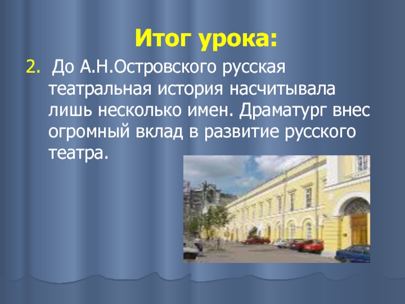 2. До А.Н.Островского русская театральная история насчитывала лишь несколько имен.