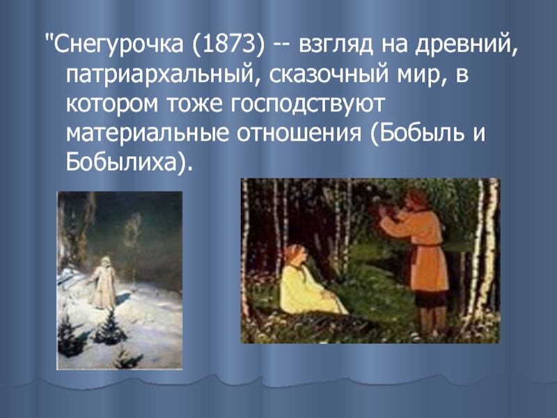 Слайд 21"Снегурочка (1873) -- взгляд на древний, патриархальный, сказочный мир, в котором тоже