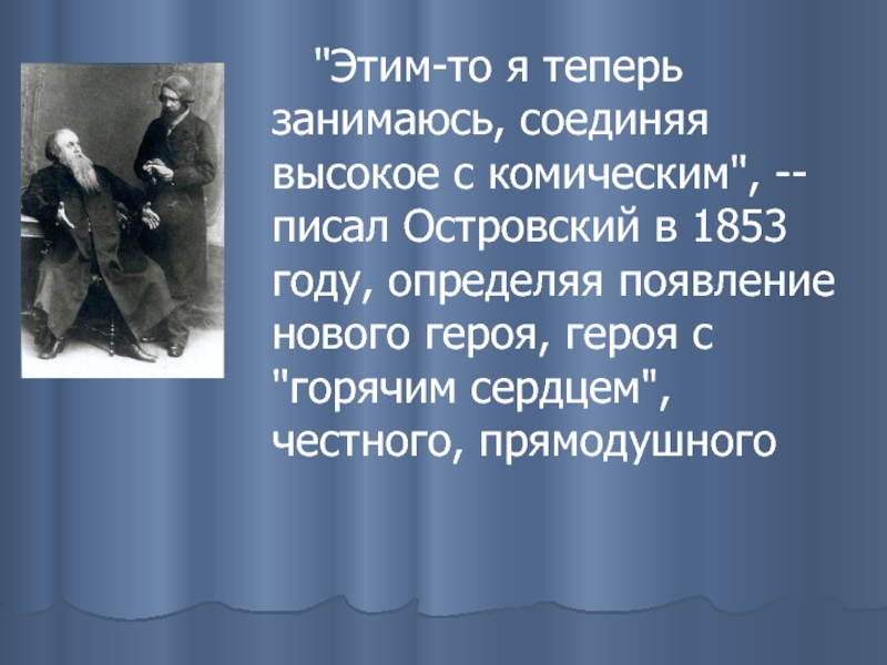 писал Островский в 1853 году, определяя появление нового героя, героя с "горячим сердцем", честного, прямодушного