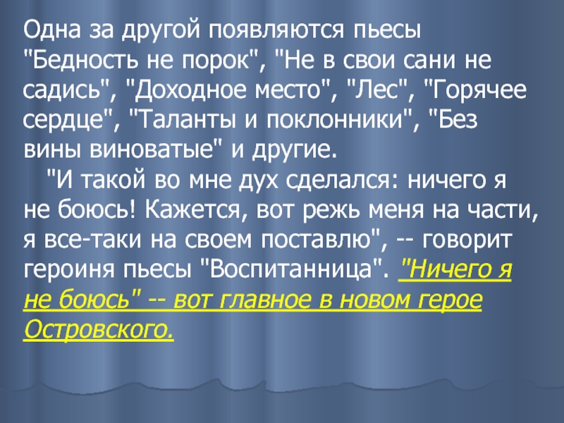 "И такой во мне дух сделался: ничего я не боюсь! Кажется, вот режь меня на части, я все-таки на своем поставлю", -- говорит героиня пьесы "Воспитанница". "Ничего я не боюсь" -- вот главное в новом герое Островского.