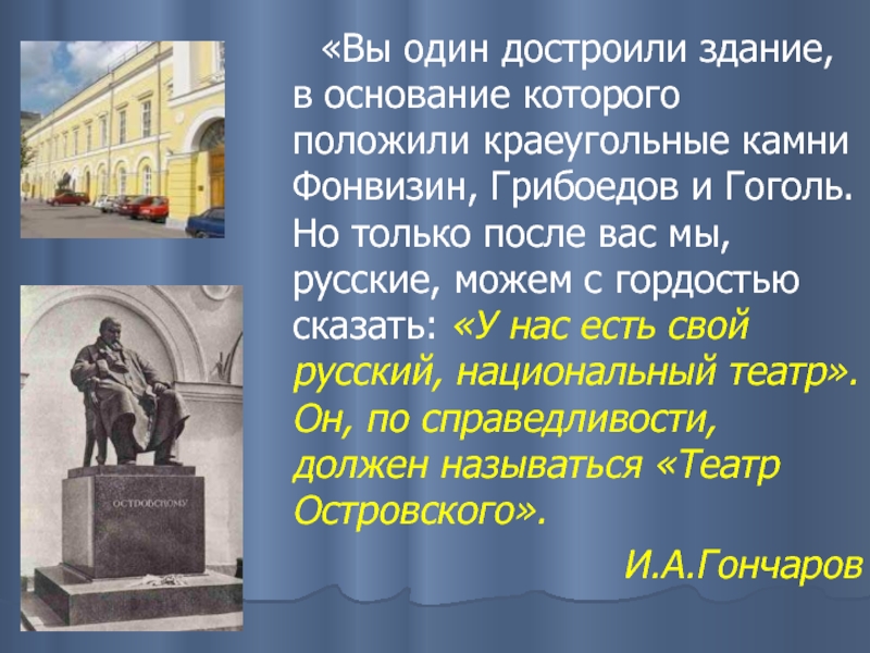 краеугольные камни Фонвизин, Грибоедов и Гоголь. Но только после вас мы, русские, можем с гордостью сказать: «У нас есть свой русский, национальный театр». Он, по справедливости, должен называться «Театр Островского».