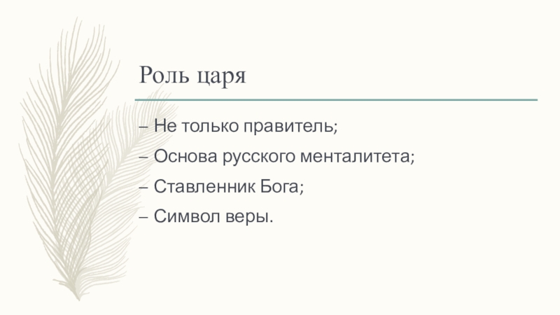 Роль царяНе только правитель;Основа русского менталитета;Ставленник Бога;Символ веры.