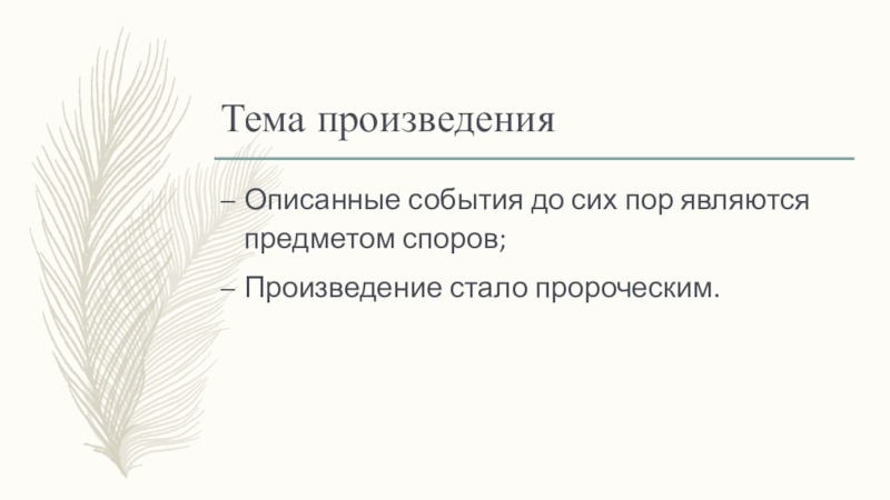 Тема произведенияОписанные события до сих пор являются предметом споров;Произведение стало пророческим.