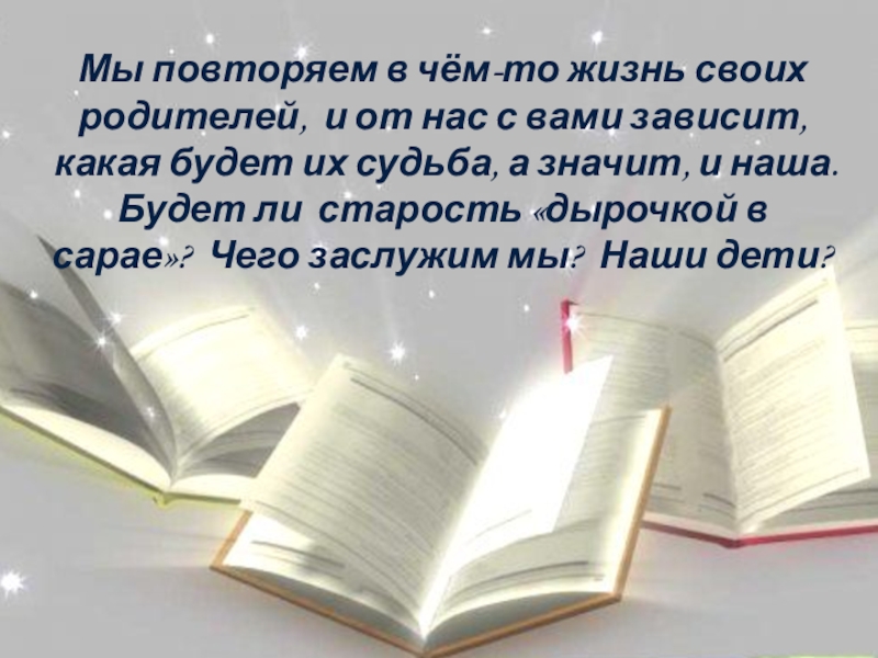 и от нас с вами зависит, какая будет их судьба, а значит, и наша. Будет ли старость «дырочкой в сарае»? Чего заслужим мы? Наши дети?