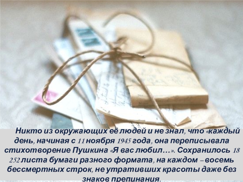 начиная с 11 ноября 1945 года, она переписывала стихотворение Пушкина «Я вас любил…». Сохранилось 18 252 листа бумаги разного формата, на каждом – восемь бессмертных строк, не утративших красоты даже без знаков препинания.