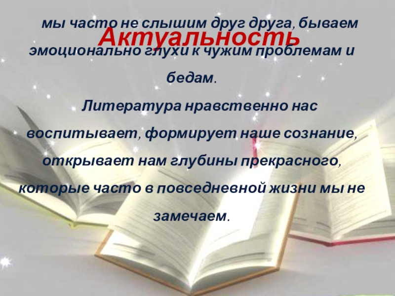 Литература нравственно нас воспитывает, формирует наше сознание, открывает нам глубины прекрасного, которые часто в повседневной жизни мы не замечаем.