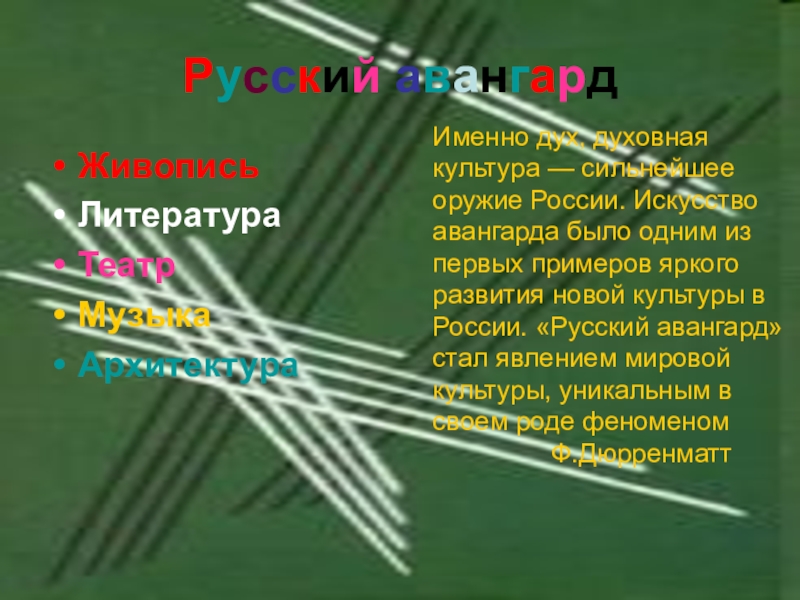 Искусство авангарда было одним из первых примеров яркого развития новой культуры в России. «Русский авангард» стал явлением мировой культуры, уникальным в своем роде феноменом