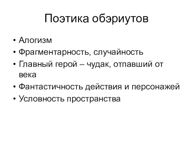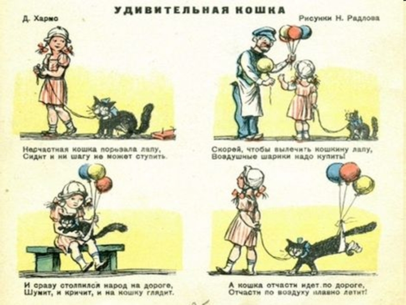 статической фигуре, но на столкновении ряда предметов, на их взаимоотношениях. В момент действия предмет принимает новые конкретные очертания, полные действительного смысла. Действие, перелицованное на новый лад, хранит в себе «классический» отпечаток и в то же время — представляет широкий размах обэриутского мироощущения