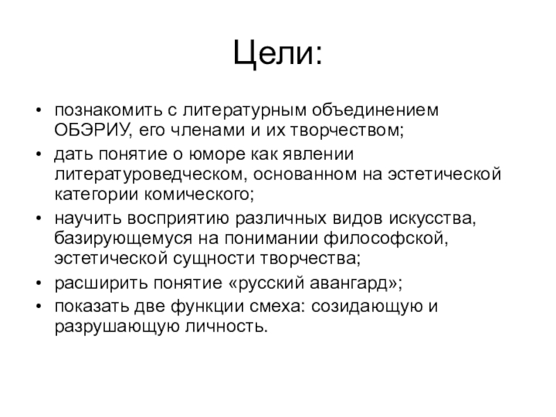 познакомить с литературным объединением ОБЭРИУ, его членами и их творчеством;