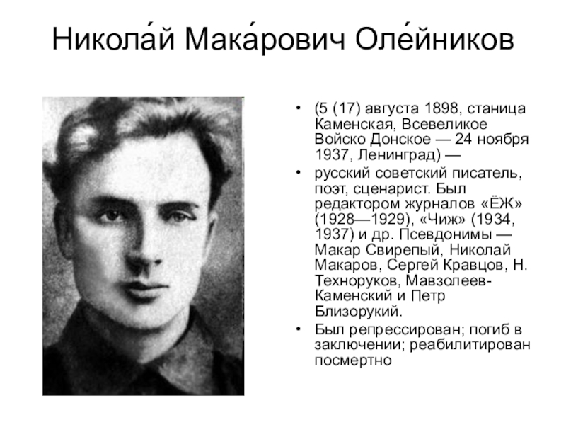русский советский писатель, поэт, сценарист. Был редактором журналов «ЁЖ» (1928—1929), «Чиж» (1934, 1937) и др. Псевдонимы — Макар Свирепый, Николай Макаров, Сергей Кравцов, Н. Техноруков, Мавзолеев-Каменский и Петр Близорукий.