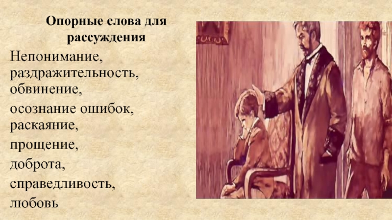 Опорные слова для рассужденияНепонимание, раздражительность, обвинение, осознание ошибок, раскаяние, прощение, доброта, справедливость, любовь