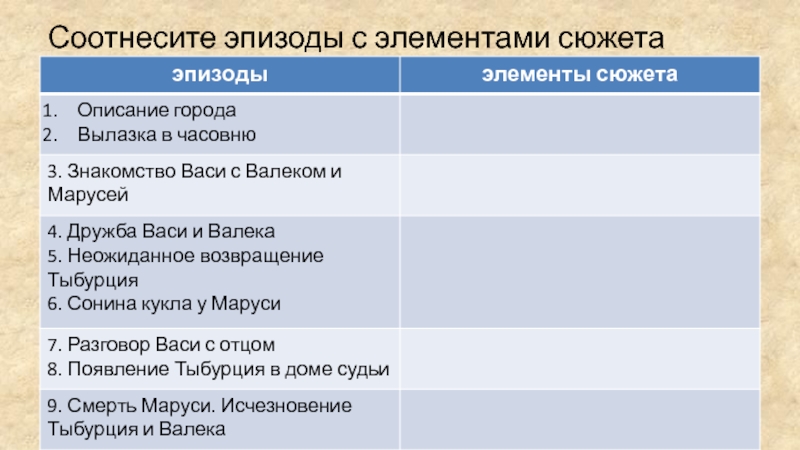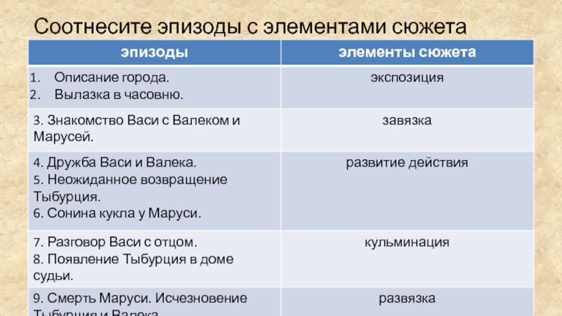 Слайд 13Соотнесите эпизоды с элементами сюжета