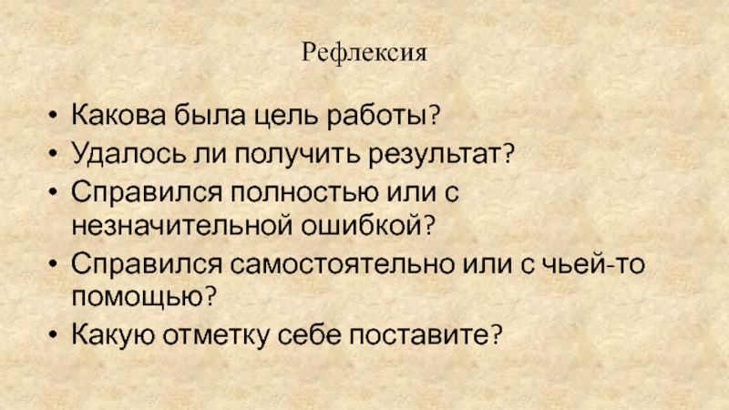 РефлексияКакова была цель работы?Удалось ли получить результат?Справился полностью или с незначительной ошибкой?Справился самостоятельно или с чьей-то помощью?Какую