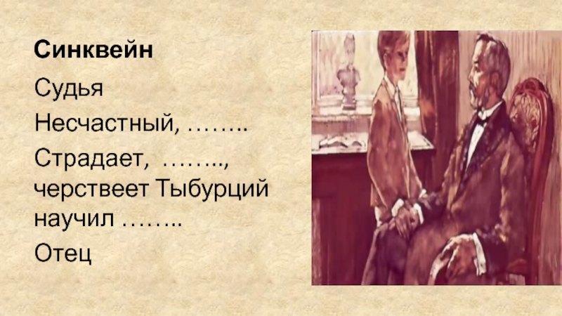 СинквейнСудьяНесчастный, ……..Страдает, …….., черствеет Тыбурций научил ……..Отец
