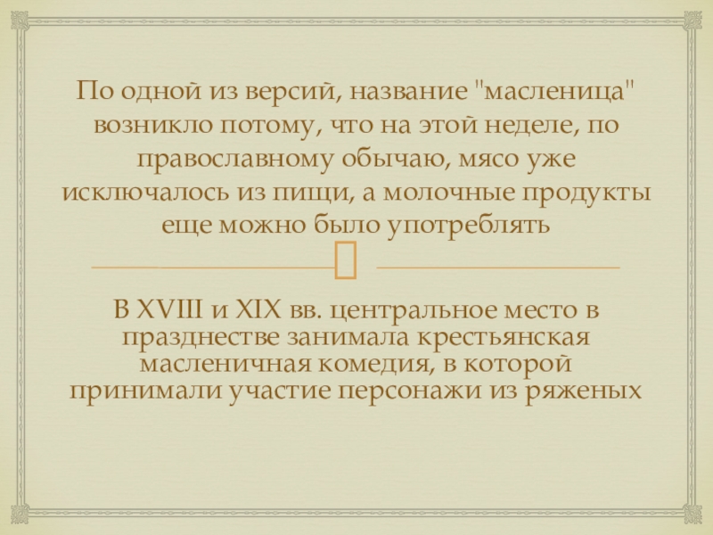 В XVIII и XIX вв. центральное место в празднестве занимала крестьянская масленичная комедия, в которой принимали участие персонажи из ряженых