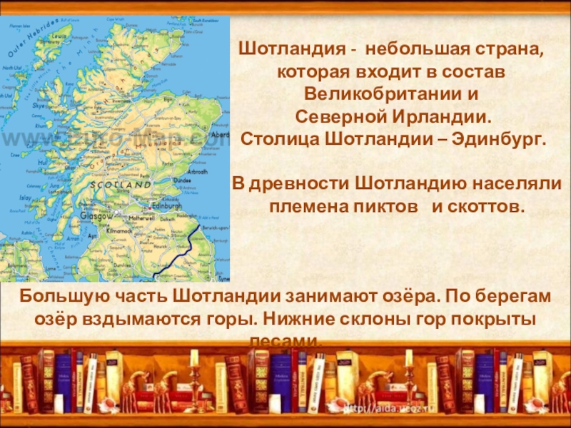 Большую часть Шотландии занимают озёра. По берегам озёр вздымаются горы. Нижние склоны гор покрыты лесами.