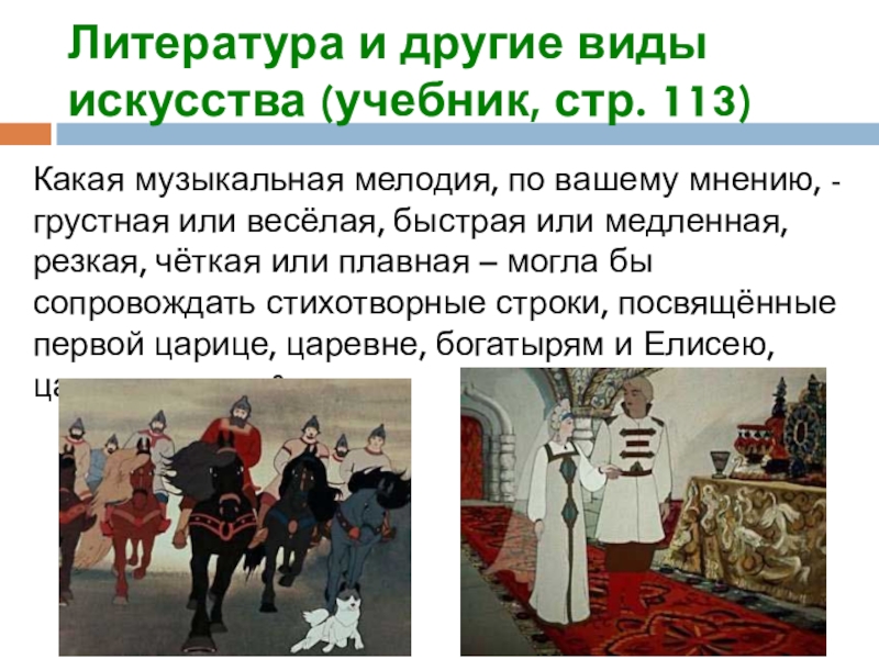 вашему мнению, - грустная или весёлая, быстрая или медленная, резкая, чёткая или плавная – могла бы сопровождать стихотворные строки, посвящённые первой царице, царевне, богатырям и Елисею, царице-мачехе?