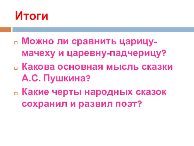ИтогиМожно ли сравнить царицу-мачеху и царевну-падчерицу?Какова основная мысль сказки А.С. Пушкина?Какие черты народных сказок сохранил и развил