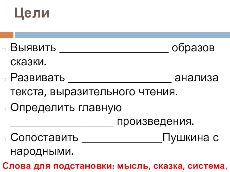 ЦелиВыявить ___________________ образов сказки.Развивать __________________ анализа текста, выразительного чтения.Определить главную __________________ произведения.Сопоставить ______________Пушкина с народными.Слова для подстановки: мысль, сказка, система, навык.