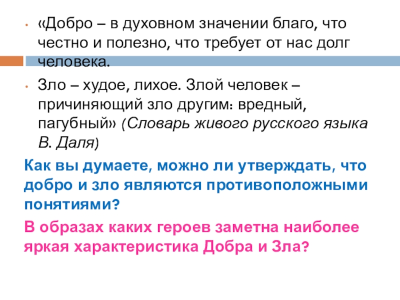 «Добро – в духовном значении благо, что честно и полезно, что требует от нас долг человека.Зло –