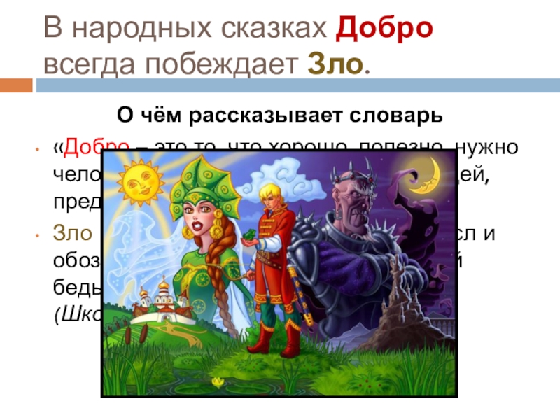 В народных сказках Добро всегда побеждает Зло.О чём рассказывает словарь«Добро – это то, что хорошо, полезно, нужно