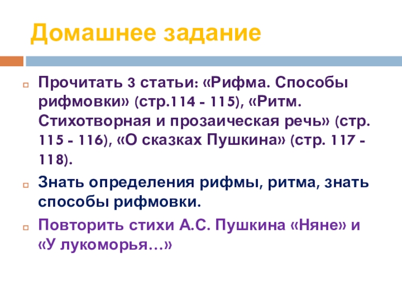 Домашнее заданиеПрочитать 3 статьи: «Рифма. Способы рифмовки» (стр.114 - 115), «Ритм. Стихотворная и прозаическая речь» (стр. 115