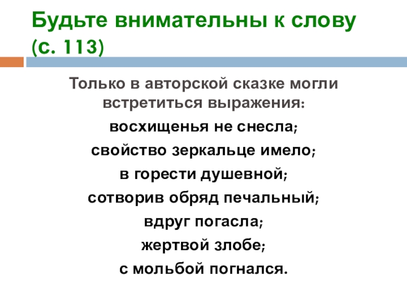 Будьте внимательны к слову (с. 113)Только в авторской сказке могли встретиться выражения:восхищенья не снесла;свойство зеркальце имело;в горести