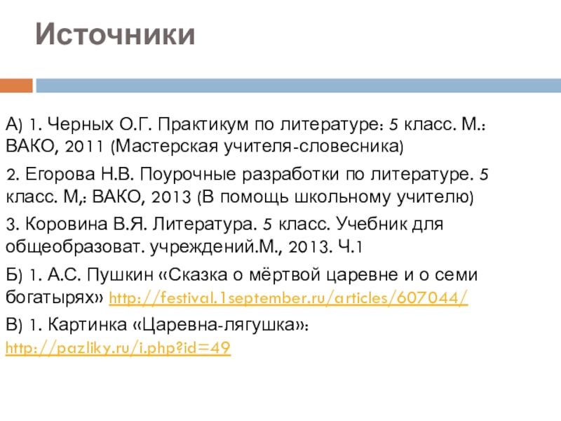 ИсточникиА) 1. Черных О.Г. Практикум по литературе: 5 класс. М.: ВАКО, 2011 (Мастерская учителя-словесника)2. Егорова Н.В. Поурочные