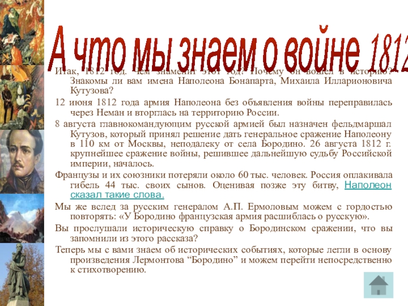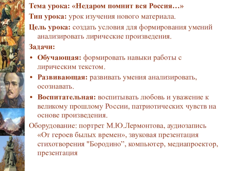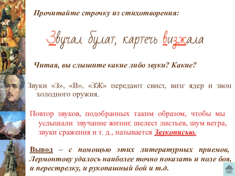 Вывод – с помощью этих литературных приемов, Лермонтову удалось наиболее точно показать и поле боя, и перестрелку, и рукопашный бой и т.д.
