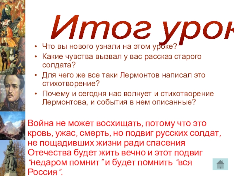 Война не может восхищать, потому что это кровь, ужас, смерть, но подвиг русских солдат, не пощадивших жизни ради спасения Отечества будет жить вечно и этот подвиг “недаром помнит” и будет помнить “вся Россия”.