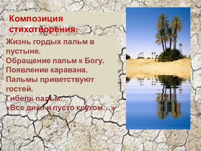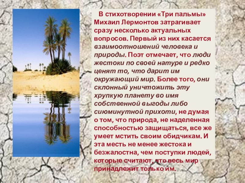 Слайд 27 В стихотворении «Три пальмы» Михаил Лермонтов затрагивает сразу несколько