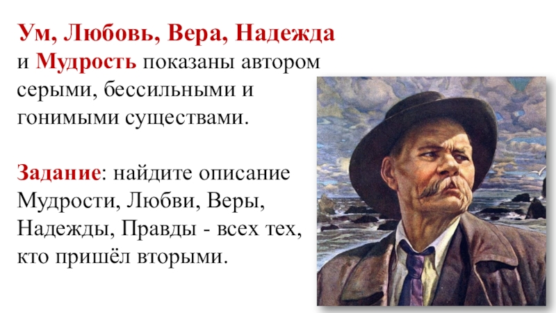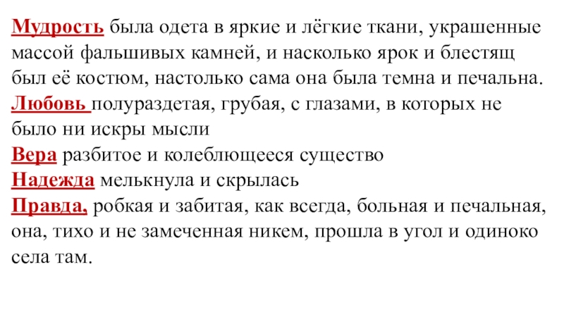 Слайд 13Ум, Любовь, Вера, Надежда и Мудрость показаны автором серыми, бессильными и