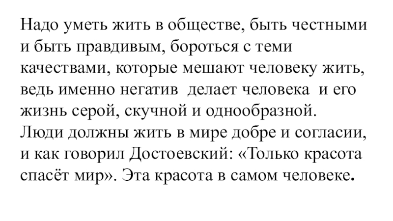 Люди должны жить в мире добре и согласии, и как говорил Достоевский: «Только красота спасёт мир». Эта красота в самом человеке.