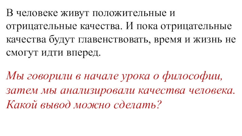 Мы говорили в начале урока о философии, затем мы анализировали качества человека. Какой вывод можно сделать?