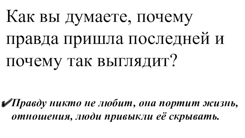 Слайд 15Как вы думаете, почему правда пришла последней и почему так выглядит?