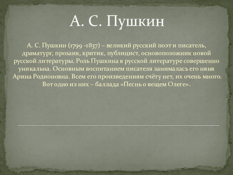 и писатель, драматург, прозаик, критик, публицист, основоположник новой русской литературы. Роль Пушкина в русской литературе совершенно уникальна. Основным воспитанием писателя занималась его няня Арина Родионовна. Всем его произведениям счёту нет, их очень много. Вот одно из них – баллада «Песнь о вещем Олеге».