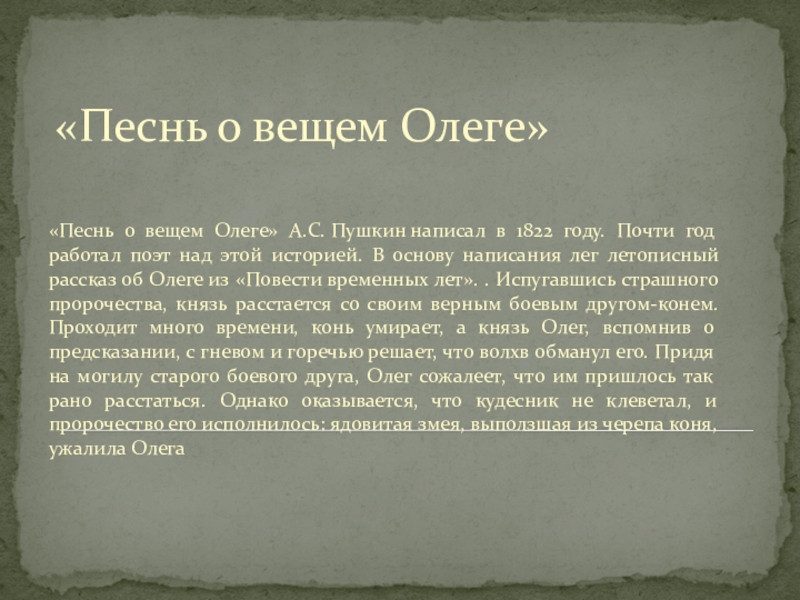 «Песнь о вещем Олеге»«Песнь о вещем Олеге» А.С. Пушкин написал в 1822 году. Почти год работал поэт над этой
