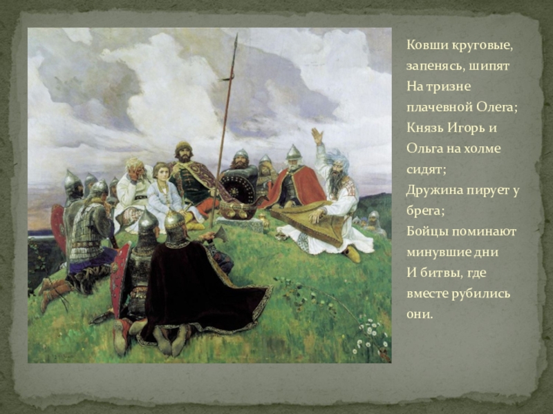Ковши круговые, запенясь, шипят На тризне плачевной Олега; Князь Игорь и Ольга на холме сидят; Дружина пирует