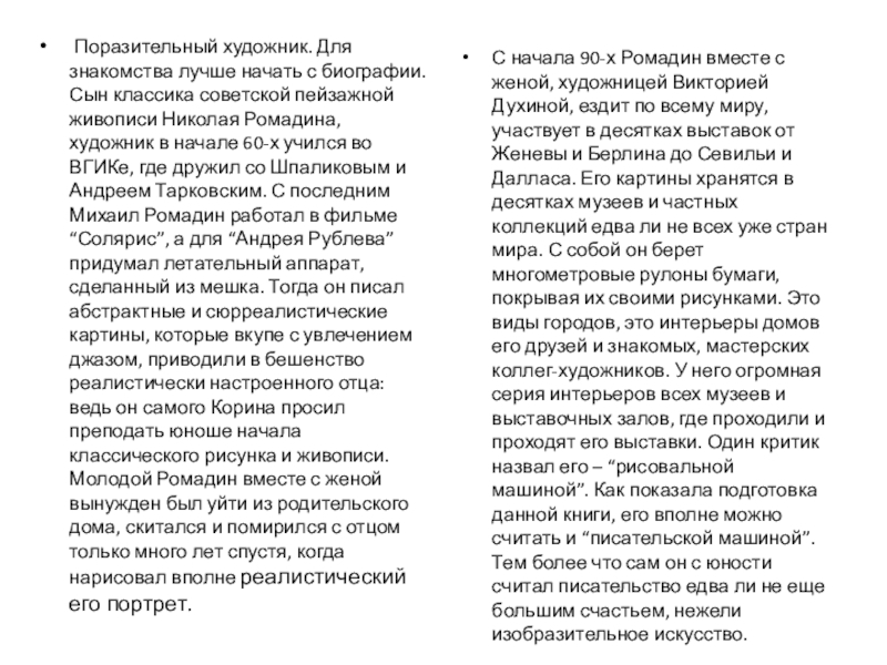 С начала 90-х Ромадин вместе с женой, художницей Викторией Духиной, ездит по всему миру, участвует в десятках выставок от Женевы и Берлина до Севильи и Далласа. Его картины хранятся в десятках музеев и частных коллекций едва ли не всех уже стран мира. С собой он берет многометровые рулоны бумаги, покрывая их своими рисунками. Это виды городов, это интерьеры домов его друзей и знакомых, мастерских коллег-художников. У него огромная серия интерьеров всех музеев и выставочных залов, где проходили и проходят его выставки. Один критик назвал его – “рисовальной машиной”. Как показала подготовка данной книги, его вполне можно считать и “писательской машиной”. Тем более что сам он с юности считал писательство едва ли не еще большим счастьем, нежели изобразительное искусство.