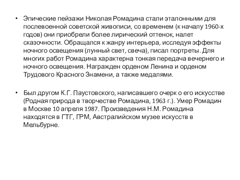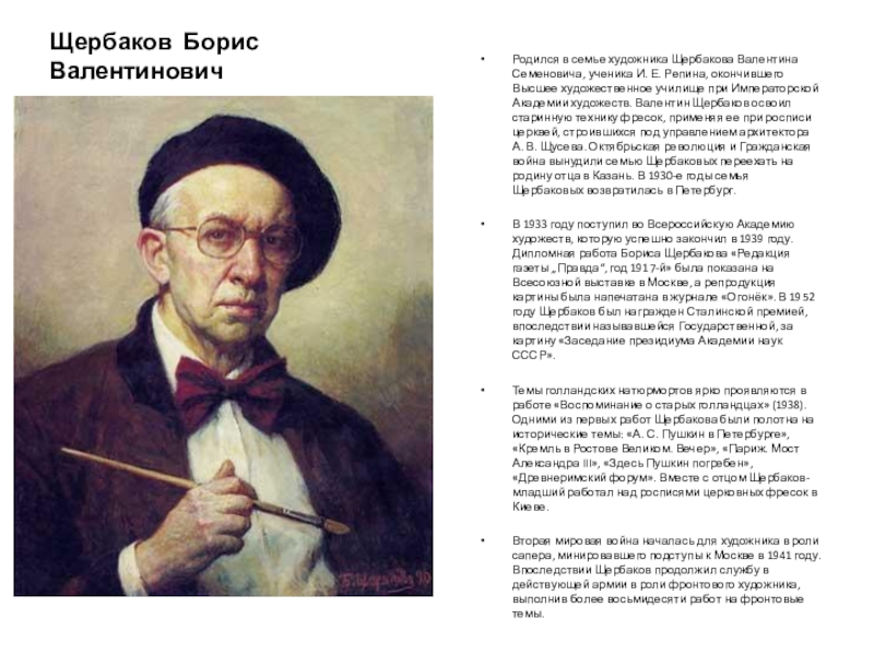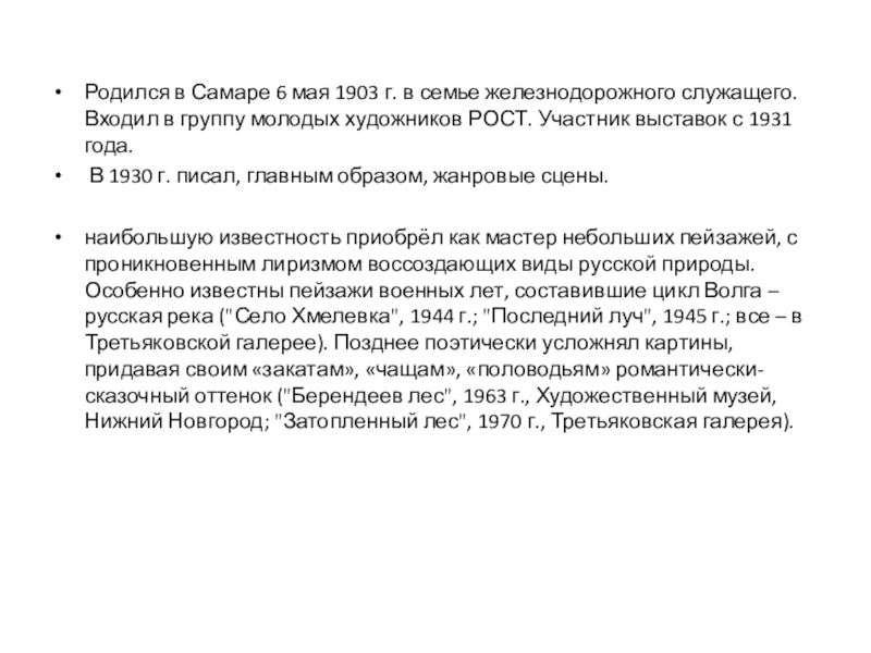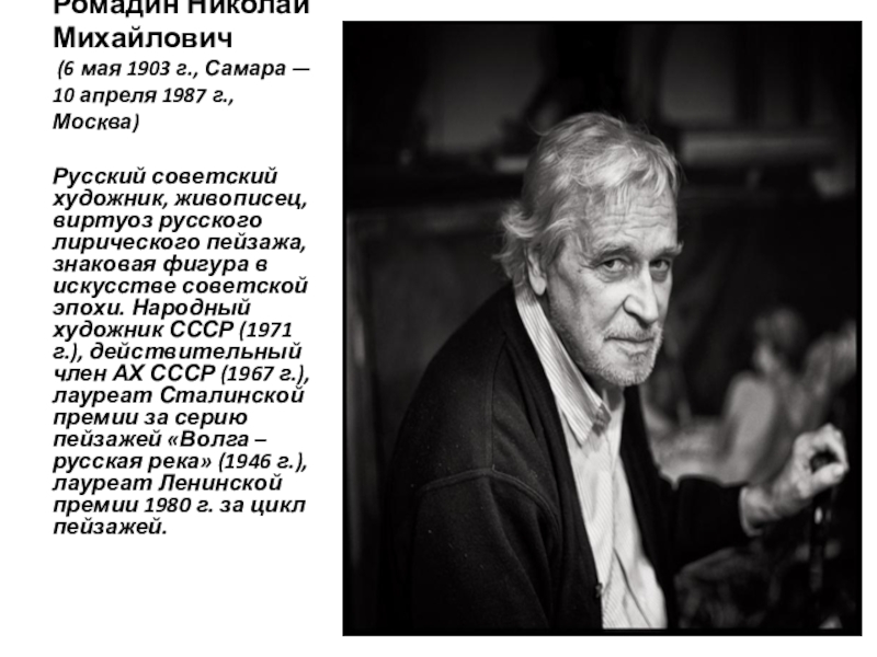 Русский советский художник, живописец, виртуоз русского лирического пейзажа, знаковая фигура в искусстве советской эпохи. Народный художник СССР (1971 г.), действительный член АХ СССР (1967 г.), лауреат Сталинской премии за серию пейзажей «Волга – русская река» (1946 г.), лауреат Ленинской премии 1980 г. за цикл пейзажей.